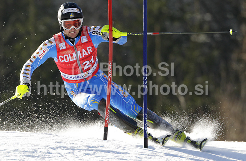 : Markus Larsson of Sweden skiing in first run of Men slalom race of Audi FIS alpine skiing World Cup 2010-2011 in Kranjska Gora, Slovenia. Men slalom race of FIS alpine skiing World Championships, was held on Sunday, 6th of March 2011, in Kranjska Gora, Slovenia.