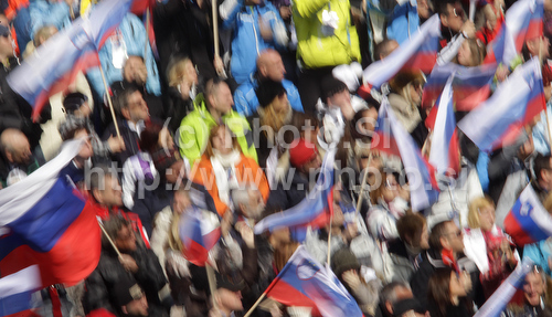 Kranjska Gora ,Slovenia - 06.03.2011 : Slovenian fans in finish of second run of Men slalom race of Audi FIS alpine skiing World Cup 2010-2011 in Kranjska Gora, Slovenia. Men slalom race of FIS alpine skiing World Championships, was held on Sunday, 6th of March 2011, in Kranjska Gora, Slovenia. Photo by: Primoz Jeroncic