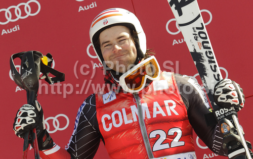 : Second placed Nolan Kasper of USA celebrates his medal won in Men slalom race of Audi FIS alpine skiing World Cup 2010-2011 in Kranjska Gora, Slovenia. Men slalom race of FIS alpine skiing World Championships, was held on Sunday, 6th of March 2011, in Kranjska Gora, Slovenia.