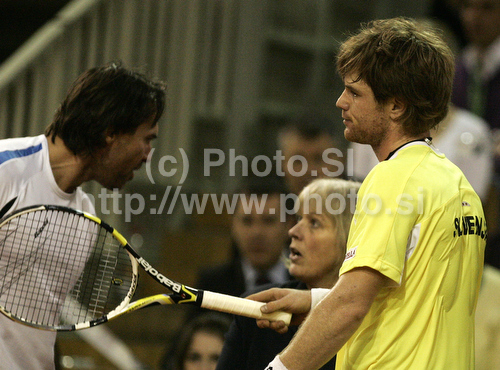 Ljubljana ,Slovenia - 06.03.2011 : Blaz Kavcic of Slovenia (R) during match of Davis Cup between Slovenia and Finland. Match between Jarkko Nieminen of Finland and Blaz Kavcic of Slovenia was held in Tivoli Arena in Ljubljana, Slovenia, on Sunday, 6th of March 2011. Photo by: Leena Jeroncic
