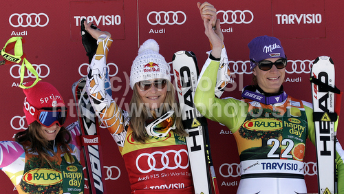 Tarvisio ,Italy - 06.03.2011 : Lindsey Vonn of USA (M) Maria Riesch of Germany (R) Julia Mancuso of USA (L) celebrates her medal won in Women super-g race of Audi FIS alpine skiing World Cup 2010-2011 in Tarvisio, Italy. Women super-g race of Audi FIS alpine skiing World Cup 2010-2011, was held on Sunday, 6th of March 2011, in Tarvisio, Italy. Photo by: Tomaz Jeroncic