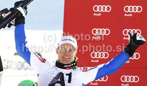: Second placed Alexis Pinturault of France celebrates his medal won in men giant slalom race of Audi FIS Alpine skiing World cup in Soelden, Austria. First race of men season 2011-2012 was held on Rettenbach glacier above Soelden, Austria, on Sunday, 23rd of October 2011.