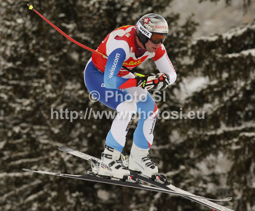 : Beat Feuz of Switzerland skiing in Men Downhill race of Audi FIS alpine skiing World Cup in Val Gardena, Italy before the race was canceled. Downhill race of Men Audi FIS Alpine skiing World Cup 2011 / 2012, was held on Saturday, 17th of December 2011, on Saslong course in Val Gardena, Italy.