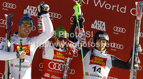 : Winner Marcel Hirscher of Austria (M), second placed Giuliano Razzoli of Italy (L) and third placed Felix Neureuther of Germany (R) celebrate their medals won in men slalom race of Audi FIS Alpine skiing World cup in Alta Badia, Italy. Men slalom race of Audi FIS Alpine skiing World cup was held on Gran Risa course in Alta Badia, Italy on Monday, 19th of December 2011.