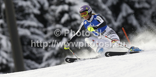 : Maria Hoefl-Riesch of Germany skiing in first run of women slalom race of Audi FIS Alpine skiing World cup in Flachau, Austria. Women slalom race of Audi FIS Alpine skiing World cup, which replaced canceled Levi race, was held in Flachau, Austria on Tuesday, 20th of December 2011.