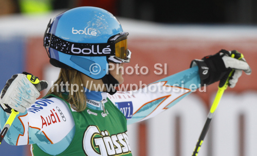 : Tanja Poutiainen of Finland reacts in finish of second run of women giant slalom race of Audi FIS Alpine skiing World cup in Lienz, Austria. Women giant slalom race of Audi FIS Alpine skiing World cup was held in Lienz, Austria on Wednesday, 28th of December 2011.
