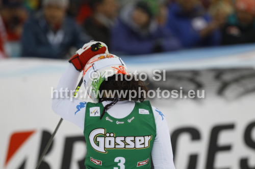 : Second placed Federica Brignone of Italy reacts in finish of second run of women giant slalom race of Audi FIS Alpine skiing World cup in Lienz, Austria. Women giant slalom race of Audi FIS Alpine skiing World cup was held in Lienz, Austria on Wednesday, 28th of December 2011.