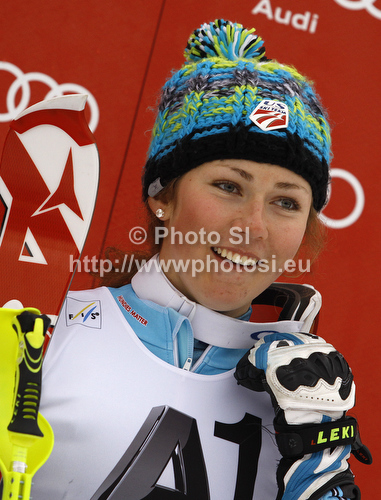 : Third placed Mikaela Shiffrin of USA celebrates her medal won in women slalom race of Audi FIS Alpine skiing World cup in Lienz, Austria. Women slalom race of Audi FIS Alpine skiing World cup was held in Lienz, Austria on Thursday, 29th of December 2011.