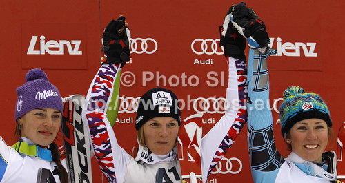 : Winner Marlies Schild of Austria (M), second placed Tina Maze of Slovenia (L) and third placed Mikaela Shiffrin of USA (R) celebrate their medals won in women slalom race of Audi FIS Alpine skiing World cup in Lienz, Austria. Women slalom race of Audi FIS Alpine skiing World cup was held in Lienz, Austria on Thursday, 29th of December 2011.
