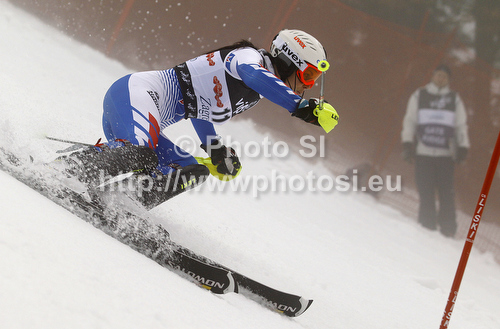 : Nastasia Noens of France skiing in first run of women slalom race of Audi FIS Alpine skiing World cup in Zagreb, Croatia. Women slalom race of Audi FIS Alpine skiing World cup was held on Sljeme above Zagreb, Croatia, on Tuesday, 3rd of January 2012.