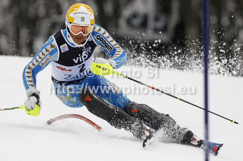 : Andre Myhrer of Sweden skiing in first run of men slalom race of Audi FIS Alpine skiing World cup in Zagreb, Croatia. Men slalom race of Audi FIS Alpine skiing World cup was held on Sljeme above Zagreb, Croatia, on Thursday, 5th of January 2012.