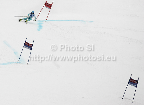: Tanja Poutiainen of Finland skiing in first run of women giant slalom race of Audi FIS Alpine skiing World cup in Kranjska Gora, Slovenia. Traditional Golden fox trophy women giant slalom race of Audi FIS Alpine skiing World cup, which was scheduled to be run in Maribor, Slovenia, was moved to Kranjska Gora, Slovenia, due warm weather and lack of snow in Maribor, and was held in Kranjska Gora, Slovenia, on Saturday, 21st of January 2012.