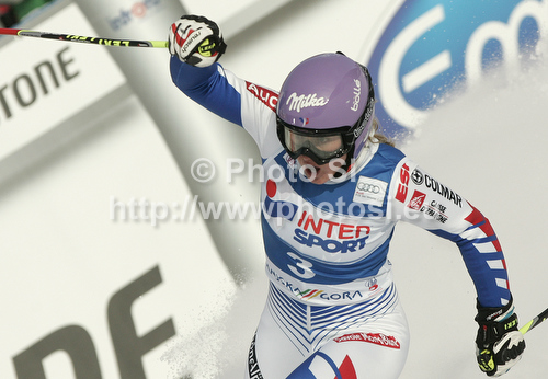 : Winner Tessa Worley of France reacts in finish of second run of women giant slalom race of Audi FIS Alpine skiing World cup in Kranjska Gora, Slovenia. Traditional Golden fox trophy women giant slalom race of Audi FIS Alpine skiing World cup, which was scheduled to be run in Maribor, Slovenia, was moved to Kranjska Gora, Slovenia, due warm weather and lack of snow in Maribor, and was held in Kranjska Gora, Slovenia, on Saturday, 21st of January 2012.