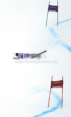 : Elisabeth Goergl of Austria falling in second run of women giant slalom race of Audi FIS Alpine skiing World cup in Kranjska Gora, Slovenia. Traditional Golden fox trophy women giant slalom race of Audi FIS Alpine skiing World cup, which was scheduled to be run in Maribor, Slovenia, was moved to Kranjska Gora, Slovenia, due warm weather and lack of snow in Maribor, and was held in Kranjska Gora, Slovenia, on Saturday, 21st of January 2012.