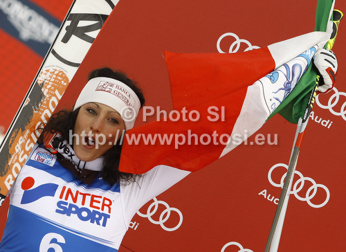 Kranjska Gora ,Slovenia - 21.01.2012 : Second placed Federica Brignone of Italy celebrates her medal won in women giant slalom race of Audi FIS Alpine skiing World cup in Kranjska Gora, Slovenia. Traditional Golden fox trophy women giant slalom race of Audi FIS Alpine skiing World cup, which was scheduled to be run in Maribor, Slovenia, was moved to Kranjska Gora, Slovenia, due warm weather and lack of snow in Maribor, and was held in Kranjska Gora, Slovenia, on Saturday, 21st of January 2012. Photo by: Primoz Jeroncic
