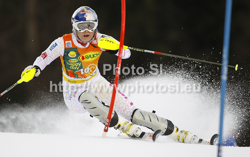 : Lindsey Vonn of USA skiing in first run of women slalom race of Audi FIS Alpine skiing World cup in Kranjska Gora, Slovenia. Traditional Golden fox trophy women slalom race of Audi FIS Alpine skiing World cup, which was scheduled to be run in Maribor, Slovenia, was moved to Kranjska Gora, Slovenia, due warm weather and lack of snow in Maribor, and was held in Kranjska Gora, Slovenia, on Sunday, 22nd of January 2012.