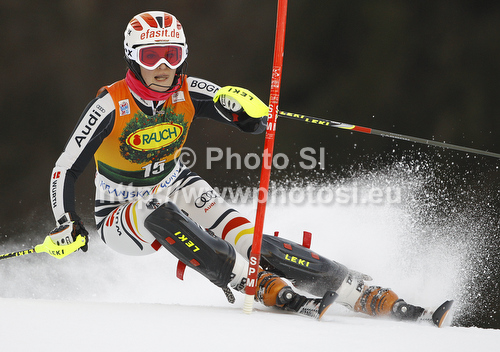 : Christina Geiger of Germany skiing in first run of women slalom race of Audi FIS Alpine skiing World cup in Kranjska Gora, Slovenia. Traditional Golden fox trophy women slalom race of Audi FIS Alpine skiing World cup, which was scheduled to be run in Maribor, Slovenia, was moved to Kranjska Gora, Slovenia, due warm weather and lack of snow in Maribor, and was held in Kranjska Gora, Slovenia, on Sunday, 22nd of January 2012.