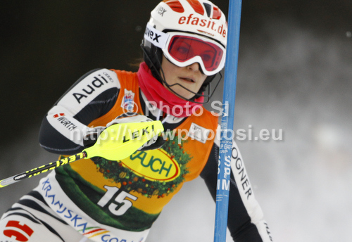 : Christina Geiger of Germany skiing in first run of women slalom race of Audi FIS Alpine skiing World cup in Kranjska Gora, Slovenia. Traditional Golden fox trophy women slalom race of Audi FIS Alpine skiing World cup, which was scheduled to be run in Maribor, Slovenia, was moved to Kranjska Gora, Slovenia, due warm weather and lack of snow in Maribor, and was held in Kranjska Gora, Slovenia, on Sunday, 22nd of January 2012.
