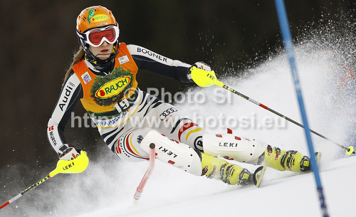 : Lena Duerr of Germany skiing in first run of women slalom race of Audi FIS Alpine skiing World cup in Kranjska Gora, Slovenia. Traditional Golden fox trophy women slalom race of Audi FIS Alpine skiing World cup, which was scheduled to be run in Maribor, Slovenia, was moved to Kranjska Gora, Slovenia, due warm weather and lack of snow in Maribor, and was held in Kranjska Gora, Slovenia, on Sunday, 22nd of January 2012.