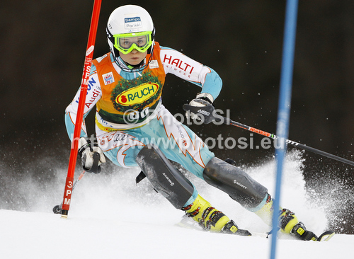 : Merle Soppela of Finland skiing in first run of women slalom race of Audi FIS Alpine skiing World cup in Kranjska Gora, Slovenia. Traditional Golden fox trophy women slalom race of Audi FIS Alpine skiing World cup, which was scheduled to be run in Maribor, Slovenia, was moved to Kranjska Gora, Slovenia, due warm weather and lack of snow in Maribor, and was held in Kranjska Gora, Slovenia, on Sunday, 22nd of January 2012.