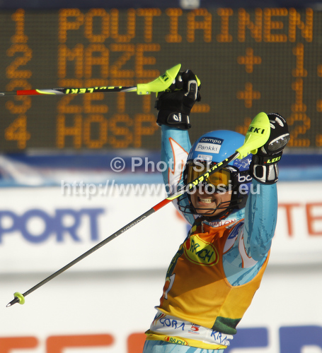 : Second pleced Tanja Poutiainen of Finland reacts in finish of second run of women slalom race of Audi FIS Alpine skiing World cup in Kranjska Gora, Slovenia. Traditional Golden fox trophy women slalom race of Audi FIS Alpine skiing World cup, which was scheduled to be run in Maribor, Slovenia, was moved to Kranjska Gora, Slovenia, due warm weather and lack of snow in Maribor, and was held in Kranjska Gora, Slovenia, on Sunday, 22nd of January 2012.