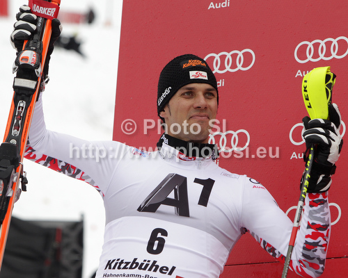 : Second placed Mario Matt of Austria celebrates his medal won in the Men Slalom race of Audi FIS alpine skiing World Cup in Kitzbuhel, Austria. Men Slalom race of Men Audi FIS Alpine skiing World Cup 2011 / 2012, was held on Sunday, 22nd of Januar 2012, on Ganslernhang course in Kitzbuhel, Austria.