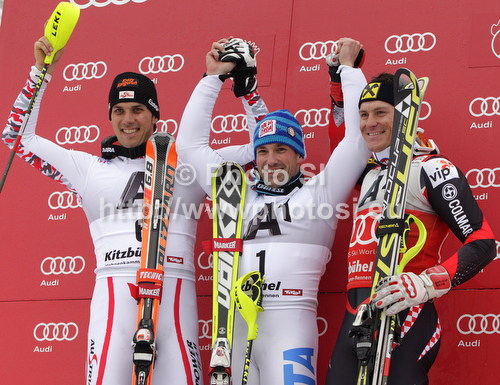 Kitzbuhel ,Austria - 22.01.2012 : Winner Cristian Deville of Italy (middle), second placed Mario Matt of Austria and third placed Ivica Kostelic of Croatia (right) celebrate their medals won in the Men Slalom race of Audi FIS alpine skiing World Cup in Kitzbuhel, Austria. Men Slalom race of Men Audi FIS Alpine skiing World Cup 2011 / 2012, was held on Sunday, 22nd of Januar 2012, on Ganslernhang course in Kitzbuhel, Austria. Photo by: Mitja Smid Bricelj