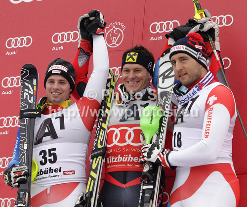 : Winner Ivica Kostelic of Croatia (middle), second placed Beat Feuz of Switzerland (left) and third placed Silvan Zurbriggen of Switzerland (right) celebrate their medals won in the Men Combination race of Audi FIS alpine skiing World Cup in Kitzbuhel, Austria. Men Combination race of Men Audi FIS Alpine skiing World Cup 2011 / 2012, was held on Sunday, 22nd of Januar 2012, on Ganslernhang course in Kitzbuhel, Austria.