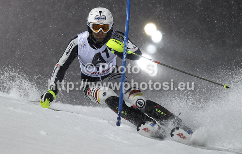 : Fritz Dopfer of Germany skiing in first run of men slalom race of Audi FIS Alpine skiing World cup in Schladming, Austria. Traditional The Nightrace, men slalom race of Audi FIS Alpine skiing World cup, was held in Schladming, Austria, on Tuesday, 24th of January 2012.