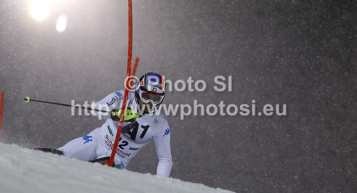 : Manfred Moelgg of Italy skiing in first run of men slalom race of Audi FIS Alpine skiing World cup in Schladming, Austria. Traditional The Nightrace, men slalom race of Audi FIS Alpine skiing World cup, was held in Schladming, Austria, on Tuesday, 24th of January 2012.