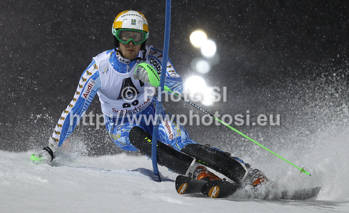 : Axel Baeck of Sweden skiing in first run of men slalom race of Audi FIS Alpine skiing World cup in Schladming, Austria. Traditional The Nightrace, men slalom race of Audi FIS Alpine skiing World cup, was held in Schladming, Austria, on Tuesday, 24th of January 2012.