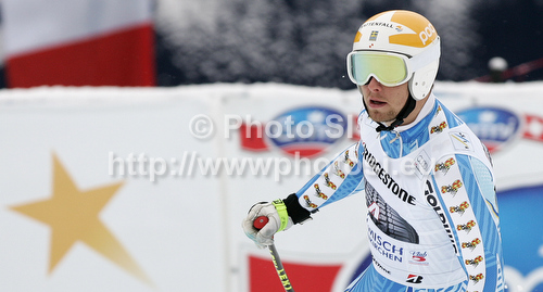 : Olsson Hans of Sweden reacts in finish of men downhill race of Audi FIS Alpine skiing World cup in Garmisch-Partenkirchen, Germany. Men downhill race of Audi FIS Alpine skiing World cup, was held in Garmisch-Partenkirchen, Germany, on Saturday, 28th of January 2012.