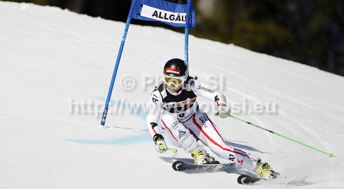 : Elisabeth Goergl of Austria skiing in first run of women giant slalom race of Audi FIS Alpine skiing World cup in Ofterschwang, Germany. Women giant slalom race of Audi FIS Alpine skiing World cup, which replaced canceled race of Soldeau, Andora, was held in Ofterschwang, Germany, on Friday, 2nd of March 2012.