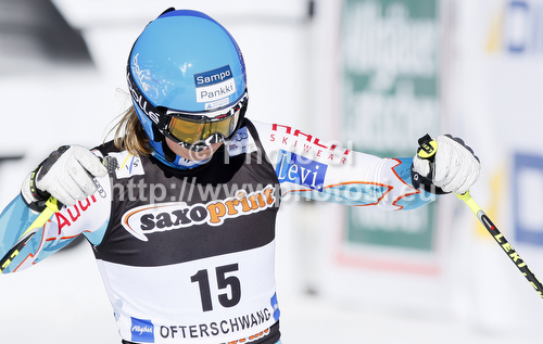 : Tanja Poutiainen of Finland reacts in finish of second run of women giant slalom race of Audi FIS Alpine skiing World cup in Ofterschwang, Germany. Women giant slalom race of Audi FIS Alpine skiing World cup, which replaced canceled race of Soldeau, Andora, was held in Ofterschwang, Germany, on Friday, 2nd of March 2012.