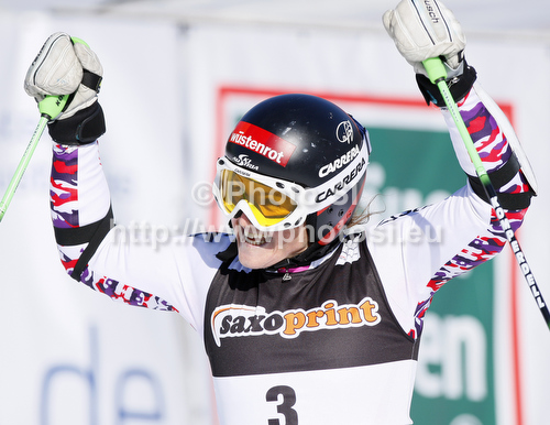 : Third placed Elisabeth Goergl of Austria reacts in finish of second run of women giant slalom race of Audi FIS Alpine skiing World cup in Ofterschwang, Germany. Women giant slalom race of Audi FIS Alpine skiing World cup, which replaced canceled race of Soldeau, Andora, was held in Ofterschwang, Germany, on Friday, 2nd of March 2012.