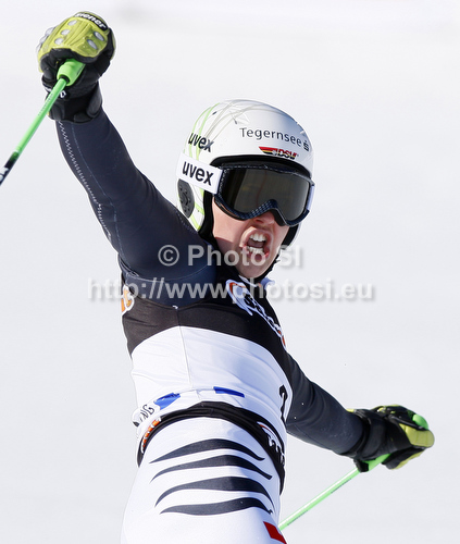 : Winner Viktoria Rebensburg of Germany reacts in finish of second run of women giant slalom race of Audi FIS Alpine skiing World cup in Ofterschwang, Germany. Women giant slalom race of Audi FIS Alpine skiing World cup, which replaced canceled race of Soldeau, Andora, was held in Ofterschwang, Germany, on Friday, 2nd of March 2012.