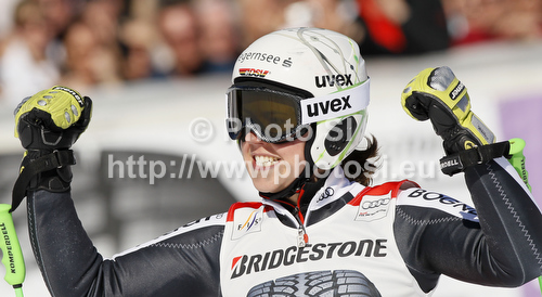 : Winner Viktoria Rebensburg of Germany reacts in finish of second run of women giant slalom race of Audi FIS Alpine skiing World cup in Ofterschwang, Germany. Women giant slalom race of Audi FIS Alpine skiing World cup was held in Ofterschwang, Germany, on Saturday, 3rd of March 2012.