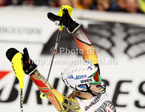 : Winner Erin Mielzynski of Canada reacts in finish of second run of women slalom race of Audi FIS Alpine skiing World cup in Ofterschwang, Germany. Women slalom race of Audi FIS Alpine skiing World cup was held in Ofterschwang, Germany, on Sunday, 4th of March 2012.