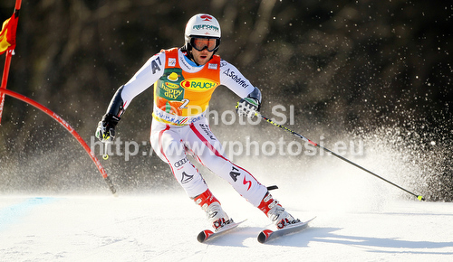 : Philipp Schoerghofer of Austria skiing in first run of men giant slalom race of Audi FIS Alpine skiing World cup in Kranjska Gora, Slovenia. Men slalom race of Audi FIS Alpine skiing World cup was held in Kranjska Gora, Slovenia, on Saturday, 10th of March 2012.