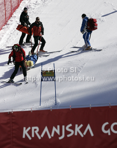 : Florian Eisath of Italy is taking down by rescue service after crashing in second run of men giant slalom race of Audi FIS Alpine skiing World cup in Kranjska Gora, Slovenia. Men slalom race of Audi FIS Alpine skiing World cup was held in Kranjska Gora, Slovenia, on Saturday, 10th of March 2012.