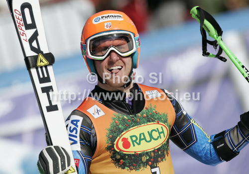 : Winner Ted Ligety of USA reacts in finish of second run of men giant slalom race of Audi FIS Alpine skiing World cup in Kranjska Gora, Slovenia. Men slalom race of Audi FIS Alpine skiing World cup was held in Kranjska Gora, Slovenia, on Saturday, 10th of March 2012.