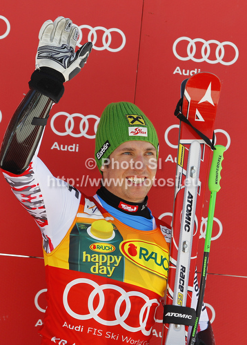 : Third placed Marcel Hirscher of Austria celebrates his medal won in men giant slalom race of Audi FIS Alpine skiing World cup in Kranjska Gora, Slovenia. Men slalom race of Audi FIS Alpine skiing World cup was held in Kranjska Gora, Slovenia, on Saturday, 10th of March 2012.