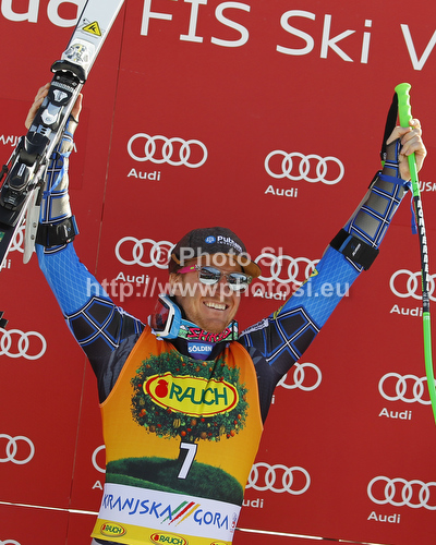 : Winner Ted Ligety of USA celebrates his medal won in men giant slalom race of Audi FIS Alpine skiing World cup in Kranjska Gora, Slovenia. Men slalom race of Audi FIS Alpine skiing World cup was held in Kranjska Gora, Slovenia, on Saturday, 10th of March 2012.