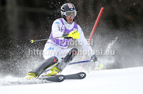 : Stefano Gross of Italy skiing in first run of men slalom race of Audi FIS Alpine skiing World cup in Kranjska Gora, Slovenia. Men slalom race of Audi FIS Alpine skiing World cup was held in Kranjska Gora, Slovenia, on Sunday, 11th of March 2012.