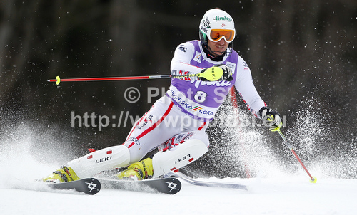 : Manfred Pranger of Austria skiing in first run of men slalom race of Audi FIS Alpine skiing World cup in Kranjska Gora, Slovenia. Men slalom race of Audi FIS Alpine skiing World cup was held in Kranjska Gora, Slovenia, on Sunday, 11th of March 2012.