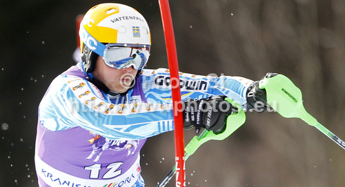 : Jens Byggmark of Sweden skiing in first run of men slalom race of Audi FIS Alpine skiing World cup in Kranjska Gora, Slovenia. Men slalom race of Audi FIS Alpine skiing World cup was held in Kranjska Gora, Slovenia, on Sunday, 11th of March 2012.