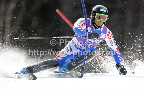 : Gabriel Rivas of France skiing in first run of men slalom race of Audi FIS Alpine skiing World cup in Kranjska Gora, Slovenia. Men slalom race of Audi FIS Alpine skiing World cup was held in Kranjska Gora, Slovenia, on Sunday, 11th of March 2012.