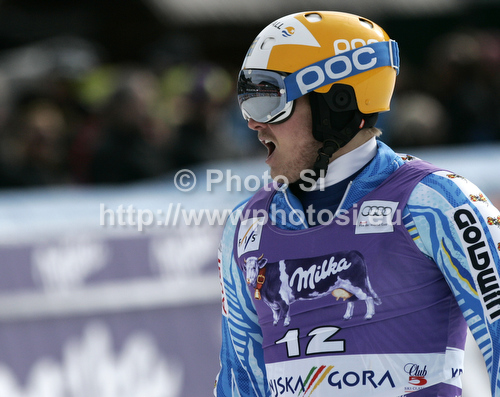 : Third after first run, Jens Byggmark of Sweden reacts in finish of first run of men slalom race of Audi FIS Alpine skiing World cup in Kranjska Gora, Slovenia. Men slalom race of Audi FIS Alpine skiing World cup was held in Kranjska Gora, Slovenia, on Sunday, 11th of March 2012.