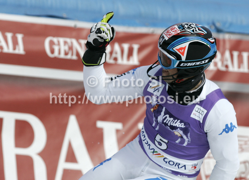 : Second placed Cristian Deville of Italy reacts in finish of second run of men slalom race of Audi FIS Alpine skiing World cup in Kranjska Gora, Slovenia. Men slalom race of Audi FIS Alpine skiing World cup was held in Kranjska Gora, Slovenia, on Sunday, 11th of March 2012.