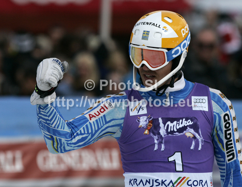 : Winner Andre Myhrer of Sweden reacts in finish of second run of men slalom race of Audi FIS Alpine skiing World cup in Kranjska Gora, Slovenia. Men slalom race of Audi FIS Alpine skiing World cup was held in Kranjska Gora, Slovenia, on Sunday, 11th of March 2012.